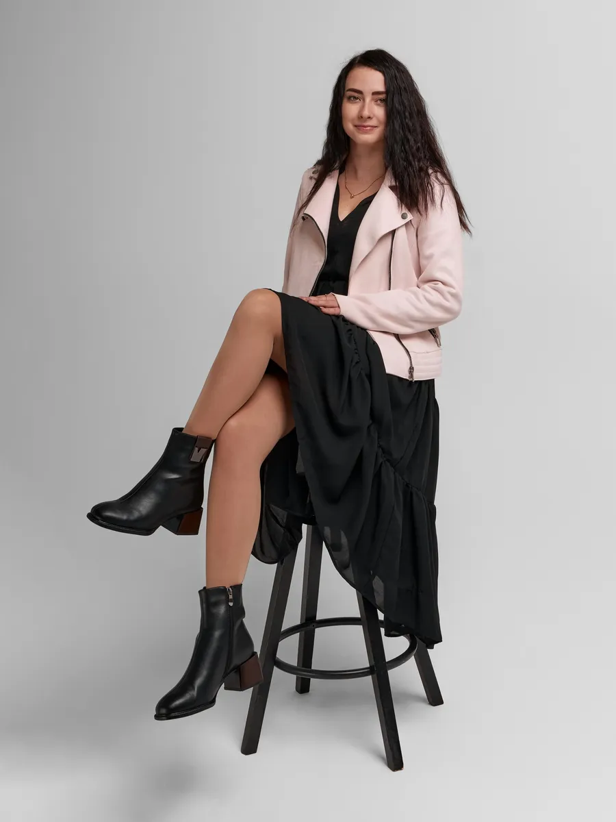 Эта удобная обувь на плоской резиновой подошве отличается прекрасной амортизацией ударов, что делает каждый шаг лёгким и приятным. Гибкий, прочный материал и низкий каблук обеспечивают комфорт даже при длительной ходьбе. Благодаря этому ботильоны подходят как для повседневных прогулок, так и для нарядных случаев, удачно сочетая моду и практичность.