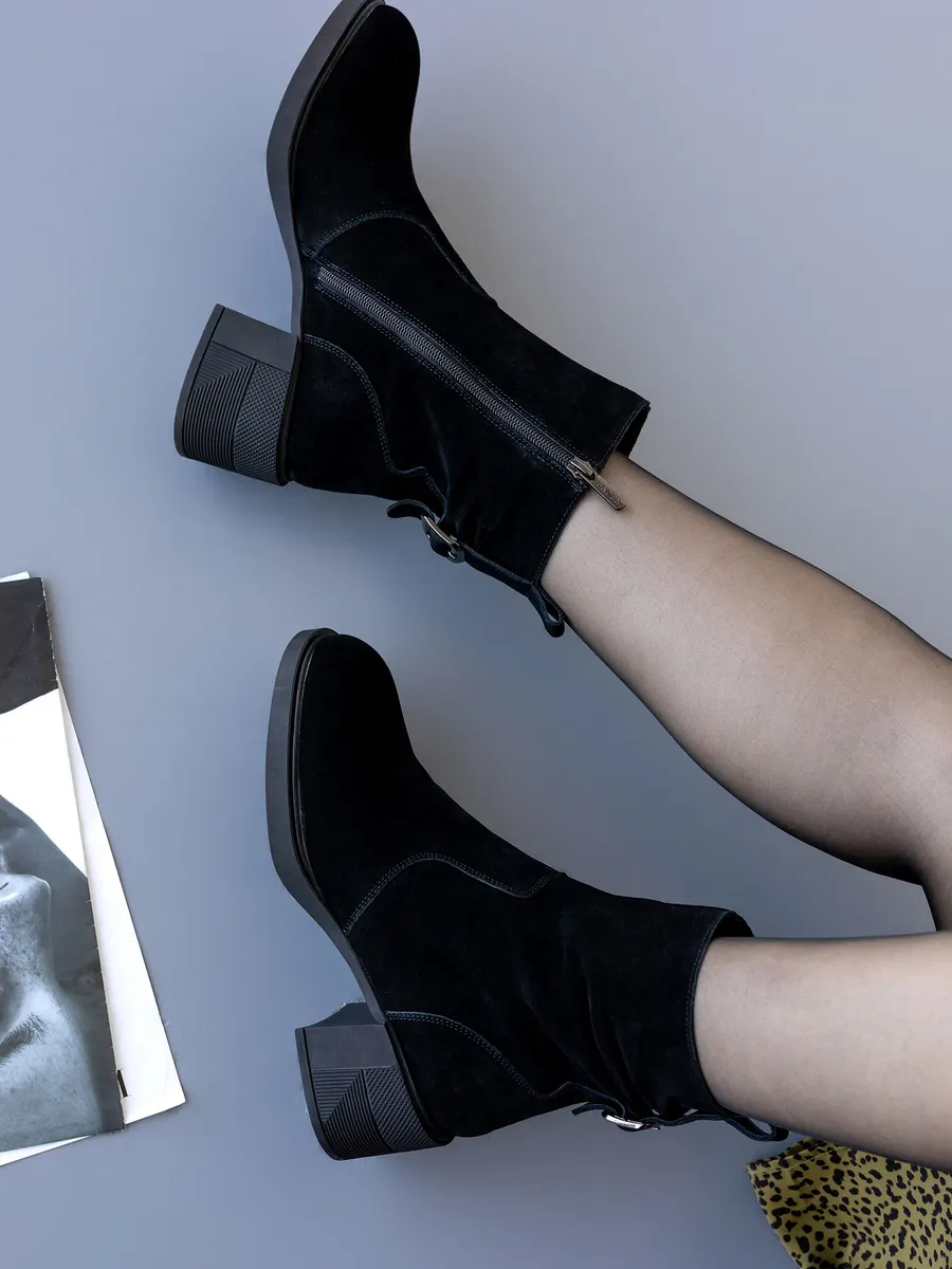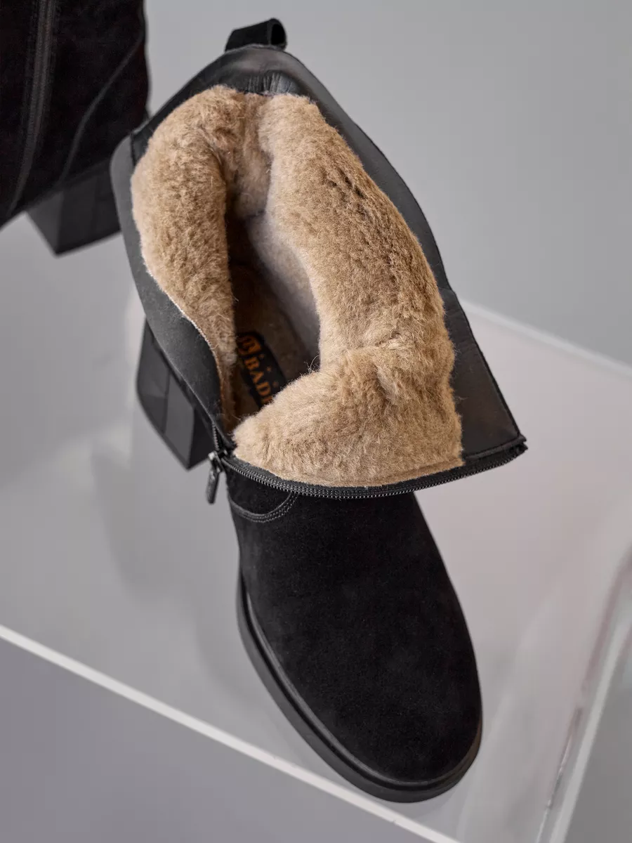 Благодаря натуральной замше, ботильоны не только выглядят стильно, но и обладают долговечностью и устойчивостью к внешним воздействиям. Эти полусапоги утеплены шерстяной подкладкой, которая обеспечивает тепло и комфорт в морозные дни, что делает их идеальными для зимы. Специальная обработка материалов позволяет обуви оставаться непромокаемой, что особенно важно в условиях влажной и снежной погоды. Молнии на боковой части сапожек облегчают процесс обувания и обеспечивают идеальную посадку на ногу.