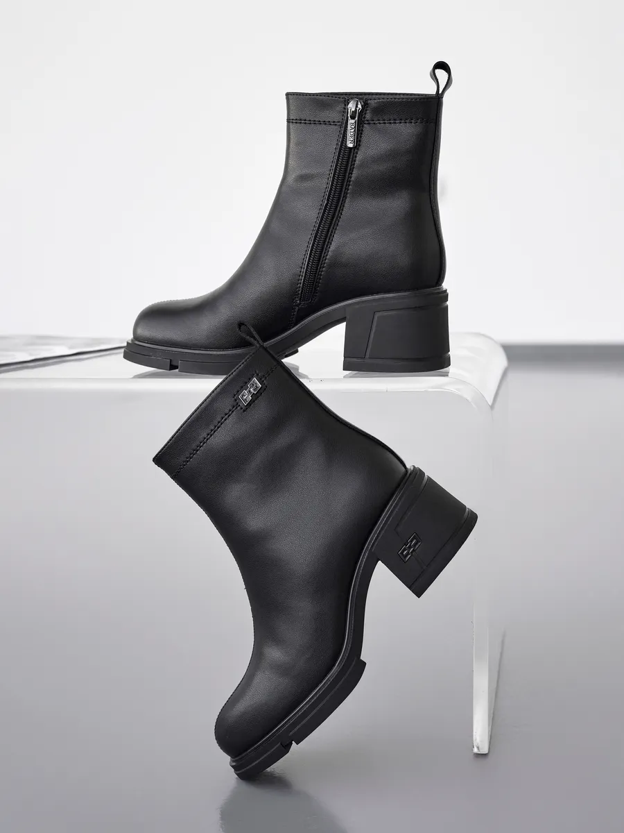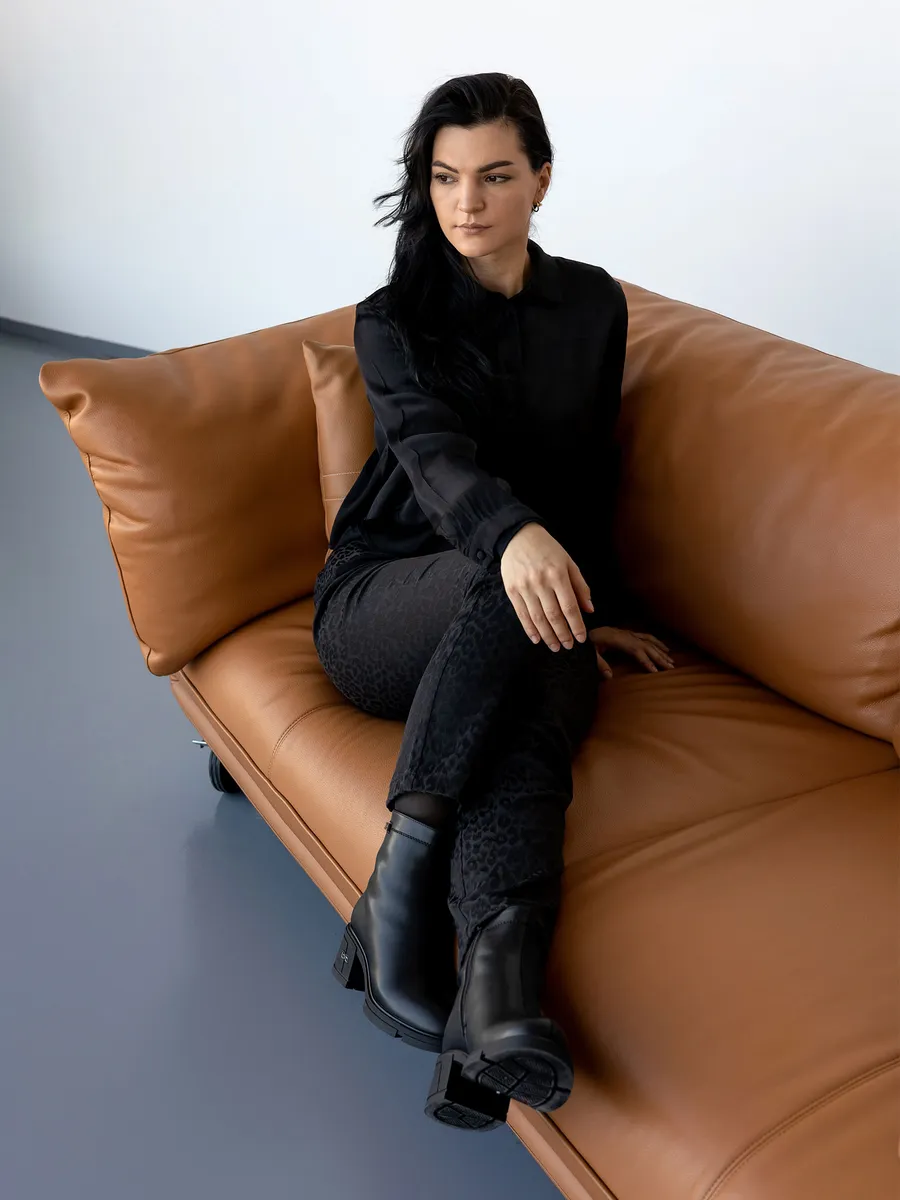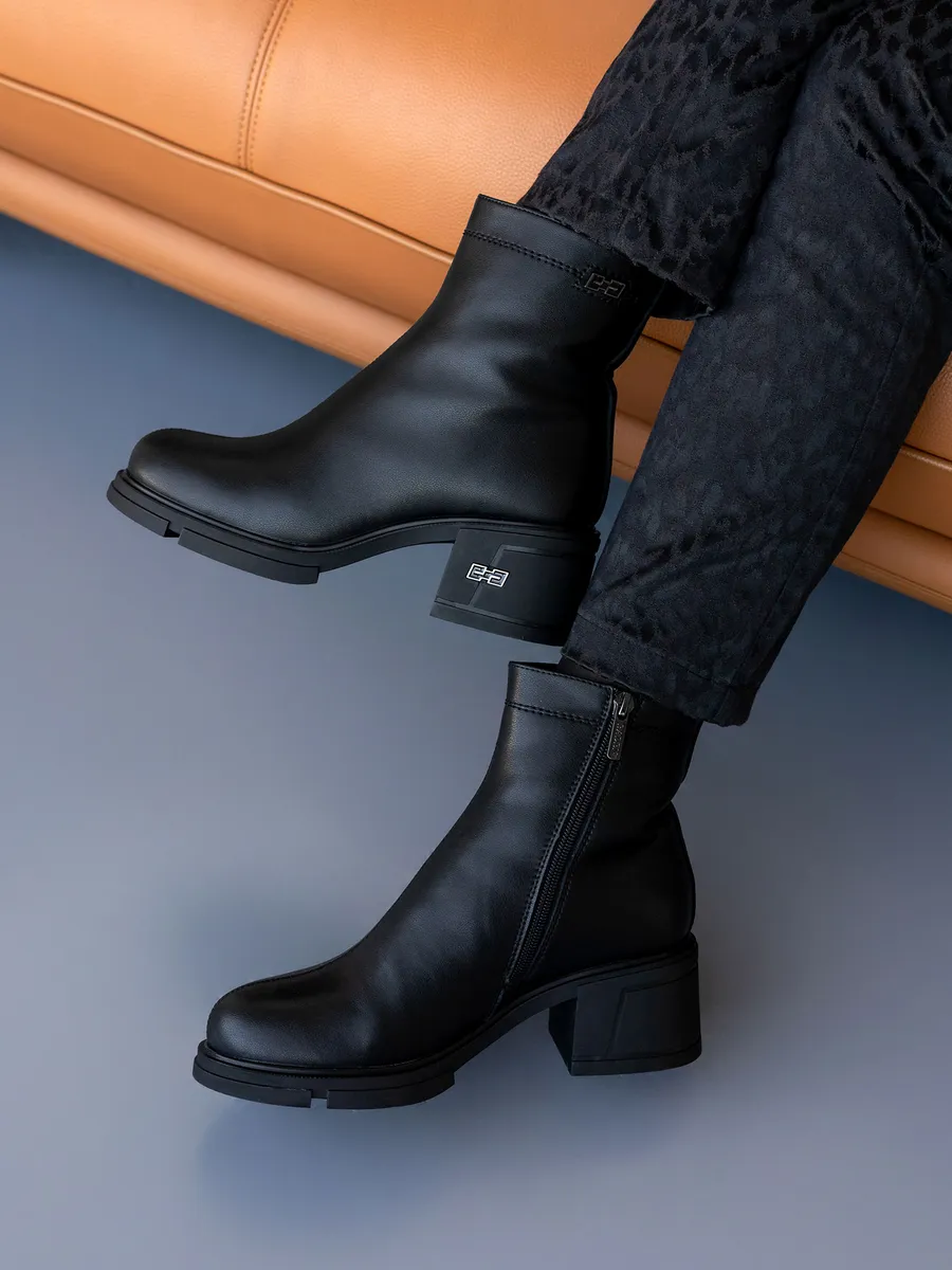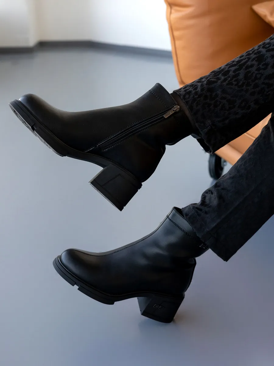 Наши короткие полусапожки черного цвета изготовлены из натуральной кожи, что гарантирует долговечность и элегантный внешний вид. Съемная стелька с ортопедическим эффектом и устойчивый каблук обеспечиват максимальный комфорт ходьбе, даже на скользкой поверхности.