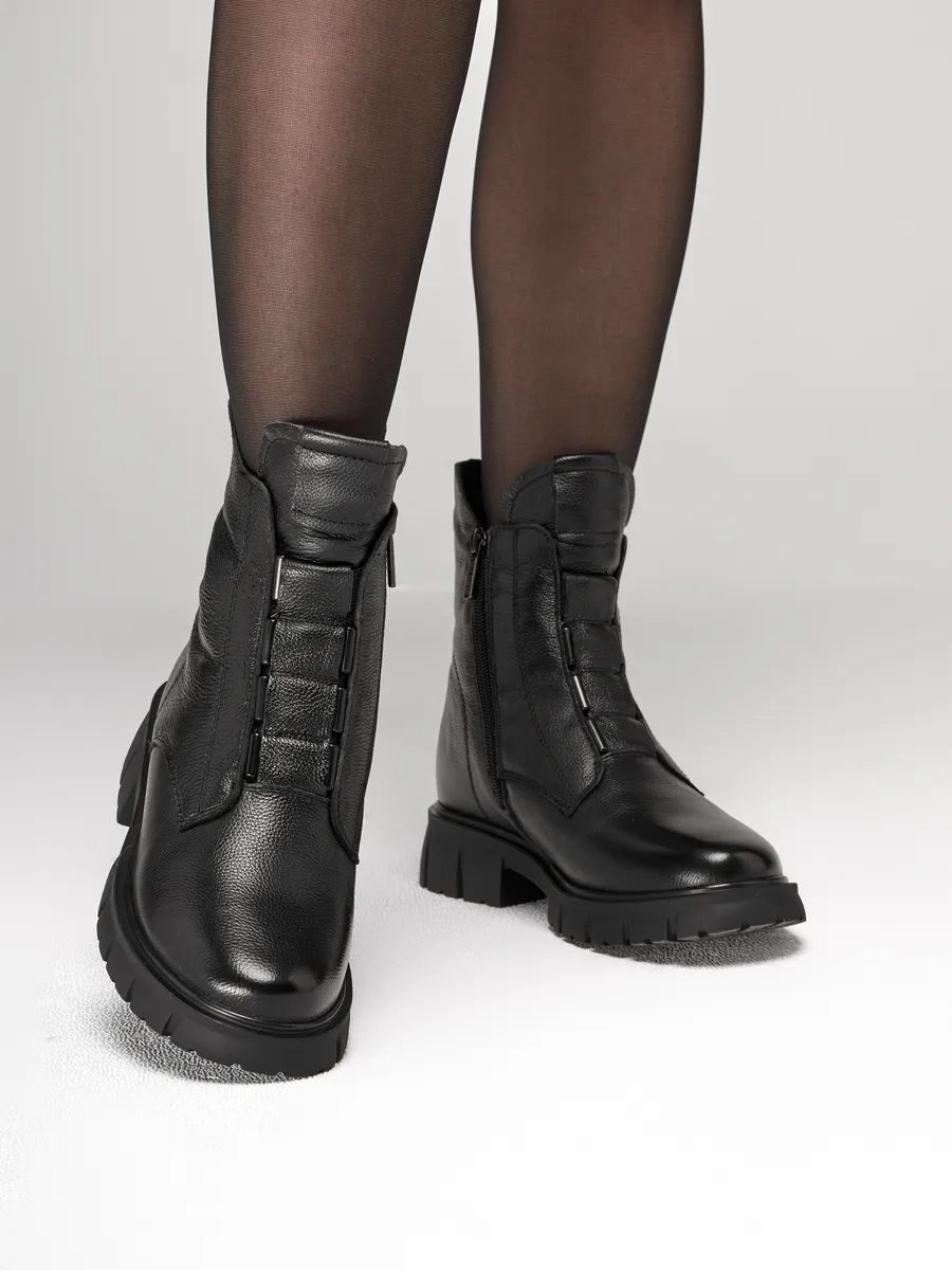 Эти женские ботинки специально разработаны для зимы, обеспечивая высокий уровень комфорта. Изготовленные из натуральной кожи, они гарантируют, что ваши ноги останутся теплыми в холодное время года. Эти утепленные сапоги идеально подходят для тех, кто ищет стильные и практичные решения. Полуботинки на платформе создают модные образы и обеспечивают уверенность на скользких поверхностях благодаря нескользящей подошве.