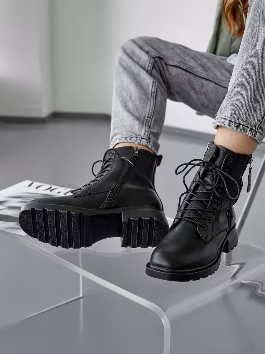 Демисезонные ботинки имеют низкий устойчивый каблук, который добавляет элегантности, но при этом остаётся удобным даже при длительной носке. Лёгкая и гибкая подошва создаёт амортизацию, снижая нагрузку на ноги, а мягкая внутренняя подкладка поддерживает оптимальный микроклимат внутри обуви. Благодаря анатомической посадке, ботинки комфортно сидят даже на широкой стопе, не сдавливая ногу.