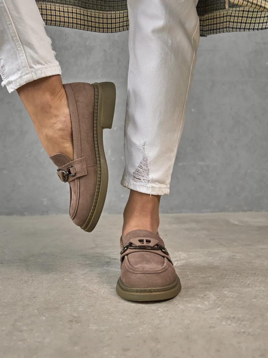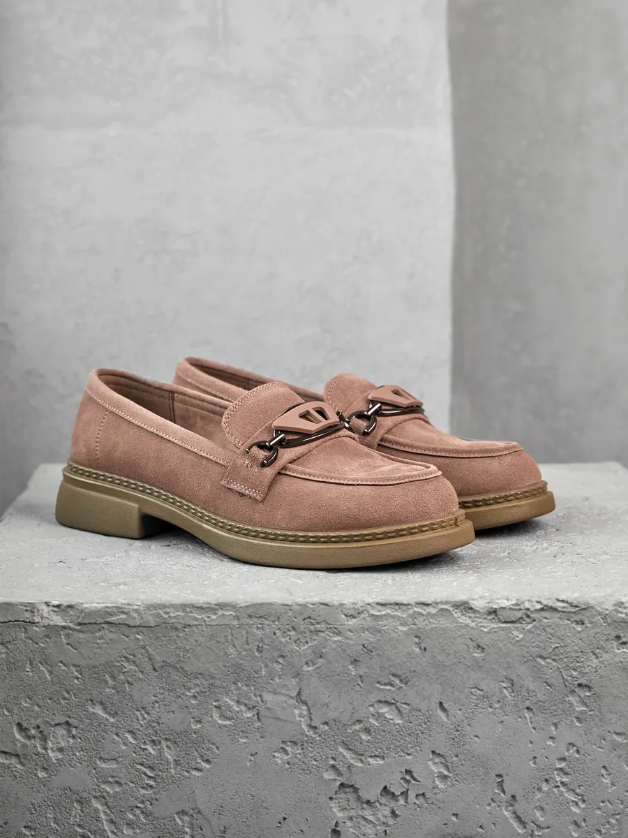 Наши лоферы выполнены из высококачественной натуральной замши, что обеспечивает долговечность и стильный внешний вид. Модная и классическая модель представлена в интересном розовом цвете с серым отливом на низком каблуке и платформе. Стелька с ортопедическим эффектом и удобная подошва гарантируют максимальный комфорт при ходьбе, даже на протяжении длительного времени.