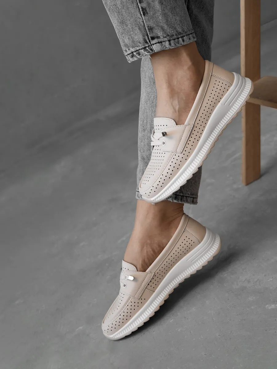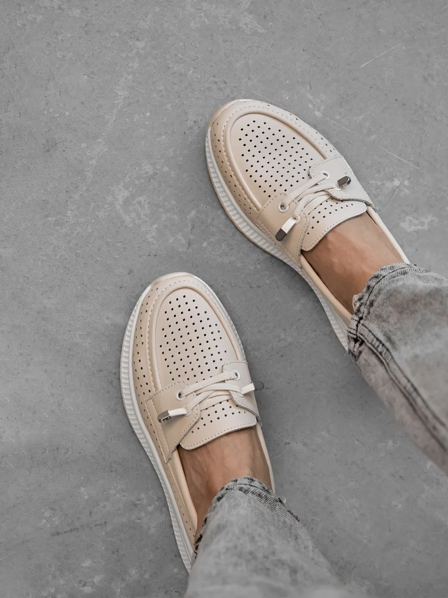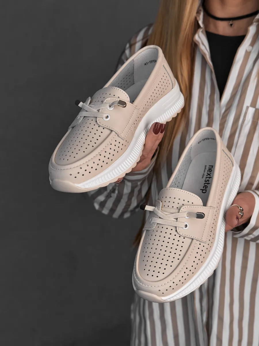 Эти мокасины легко вписываются в любой гардероб благодаря универсальному дизайну. Они подходят для повседневной носки, работы, прогулок или даже праздничных мероприятий. Нейтральный молочный цвет позволяет комбинировать их с повседневной одеждой, летними платьями или деловыми костюмами. Перфорация обеспечивают циркуляцию воздуха, создавая комфортный микроклимат для ног. Эти кожаные мокасины идеально вписываются в современный городской стиль. Их классический дизайн в сочетании с модными элементами делает их актуальными для девушек и женщин любого возраста. Лёгкость и стильный внешний вид подчеркивают изысканность вашего образа, будь то весенняя прогулка или летний ужин.