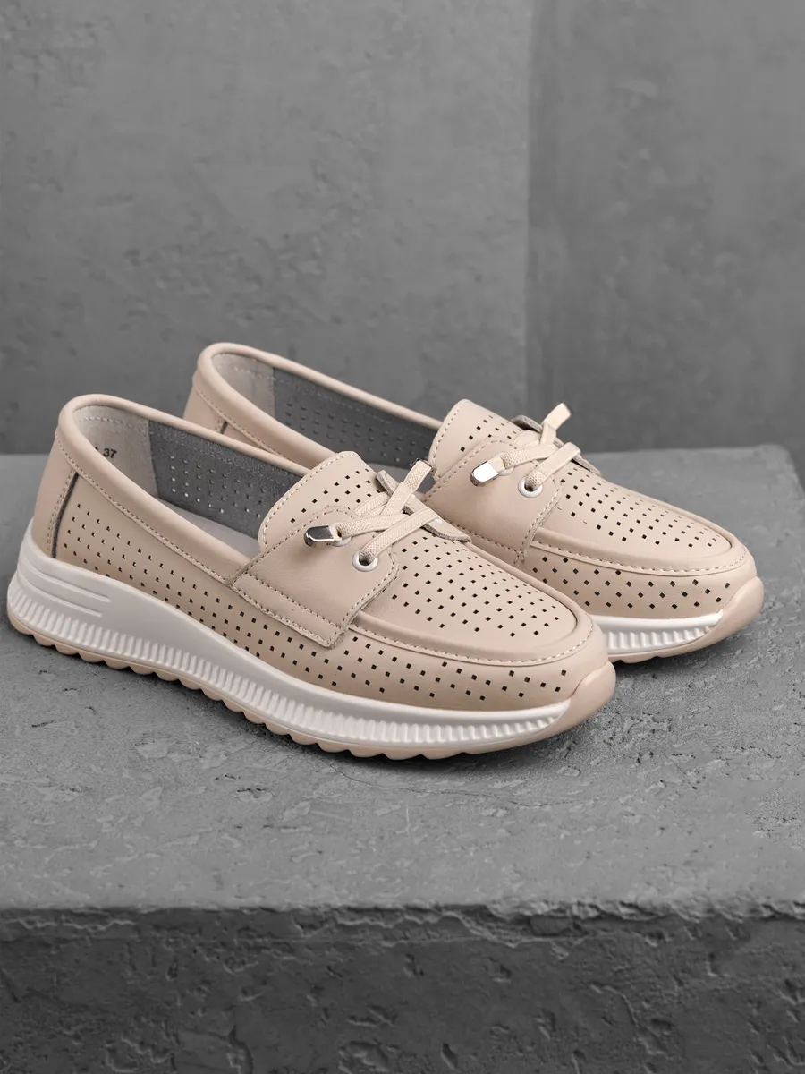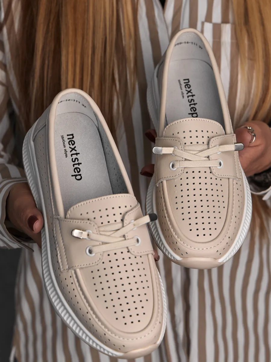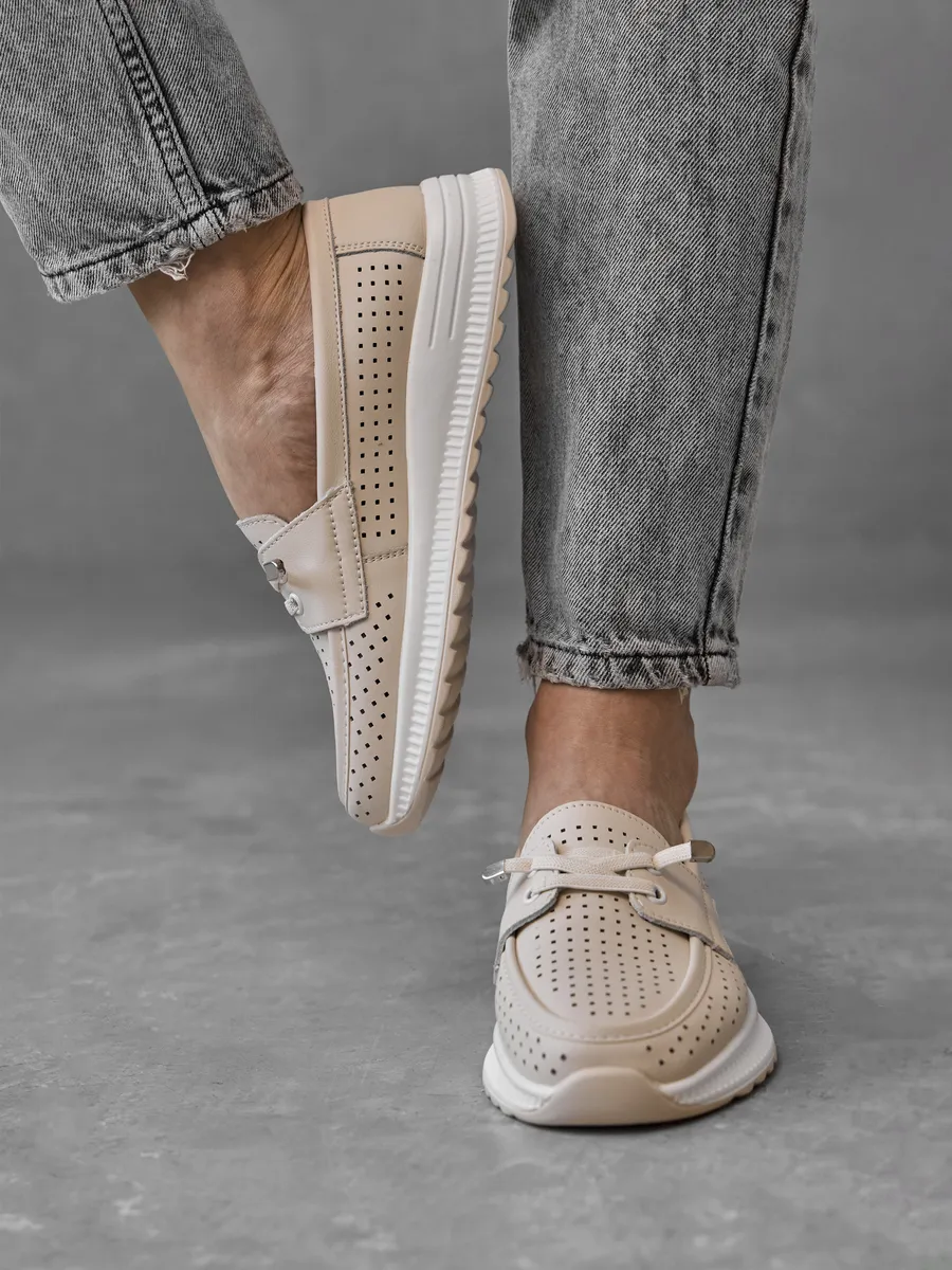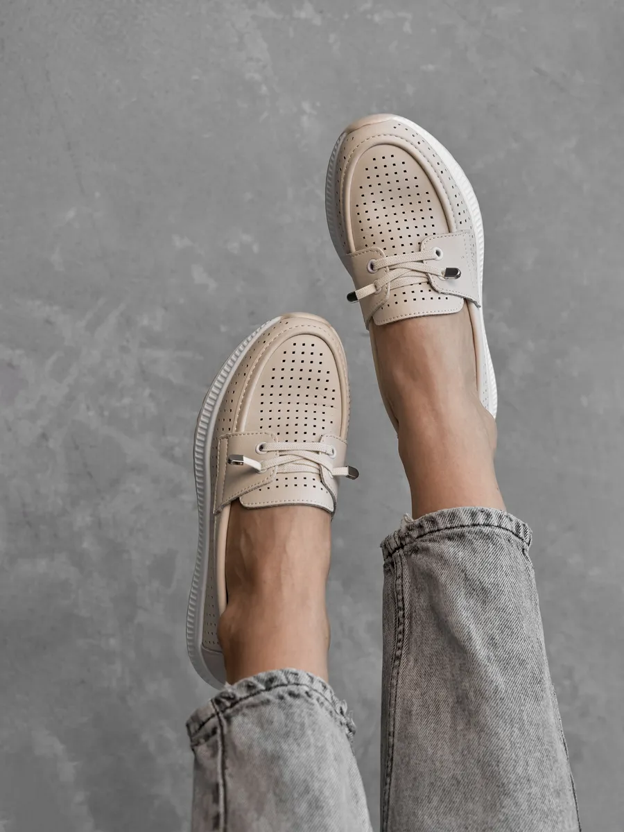 Эти мокасины легко вписываются в любой гардероб благодаря универсальному дизайну. Они подходят для повседневной носки, работы, прогулок или даже праздничных мероприятий. Нейтральный молочный цвет позволяет комбинировать их с повседневной одеждой, летними платьями или деловыми костюмами. Перфорация обеспечивают циркуляцию воздуха, создавая комфортный микроклимат для ног. Эти кожаные мокасины идеально вписываются в современный городской стиль. Их классический дизайн в сочетании с модными элементами делает их актуальными для девушек и женщин любого возраста. Лёгкость и стильный внешний вид подчеркивают изысканность вашего образа, будь то весенняя прогулка или летний ужин.