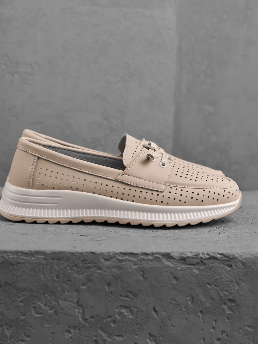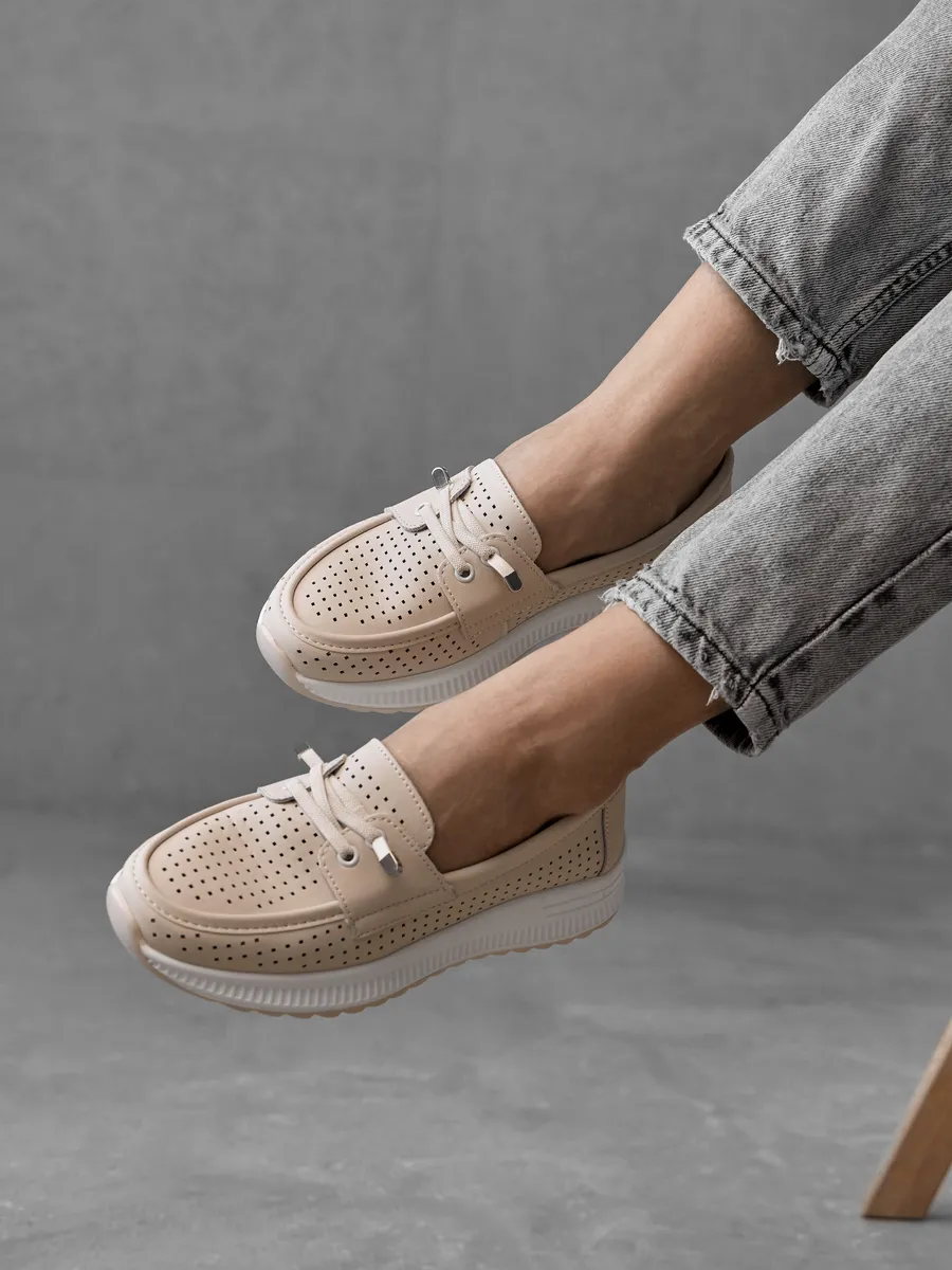 Эти женские мокасины из натуральной кожи — идеальный выбор для лета и весны. Выполненные в универсальном бежевом цвете, они сочетают элегантность, комфорт и модные тенденции, делая их подходящими для женщин, которые ценят стиль и удобство. Лёгкость и мягкость материалов гарантируют комфорт на каждом шаге, будь то прогулка, офисный день или праздничное мероприятие.