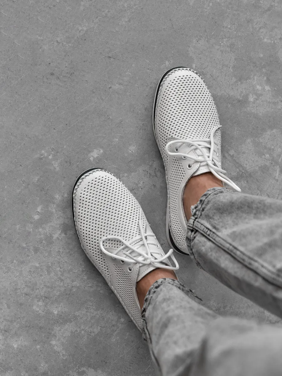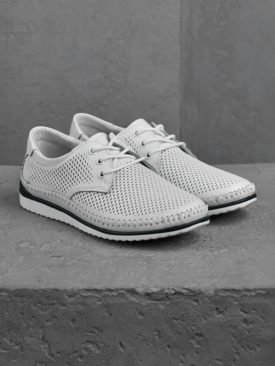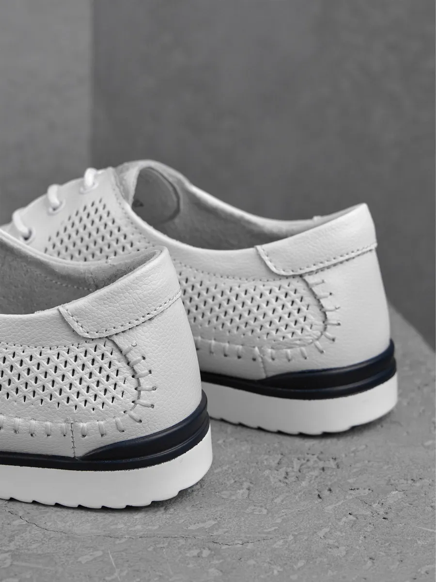Эти мокасины легко вписываются в любой гардероб благодаря универсальному дизайну. Они подходят для повседневной носки, работы, прогулок или даже праздничных мероприятий. Нейтральный белый цвет позволяет комбинировать их с повседневной одеждой, летними платьями или деловыми костюмами. Дышащие вставки с перфорацией обеспечивают циркуляцию воздуха, создавая комфортный микроклимат для ног. Эти кожаные мокасины идеально вписываются в современный городской стиль. Их классический дизайн в сочетании с модными элементами делает их актуальными для девушек, женщин любого возраста и медицинских работников. Лёгкость и стильный внешний вид подчеркивают изысканность вашего образа, будь то весенняя прогулка или летний ужин.
