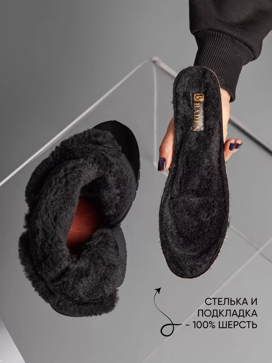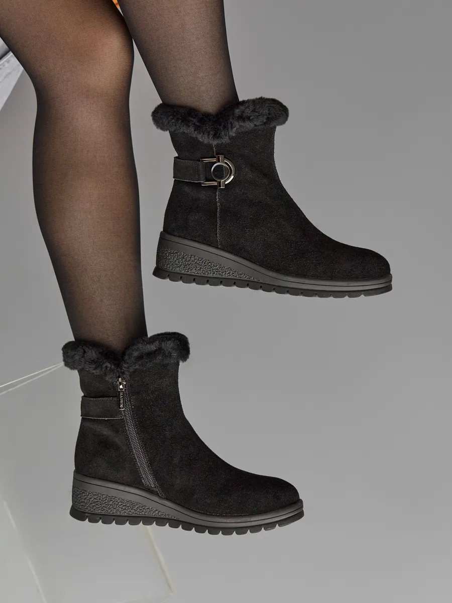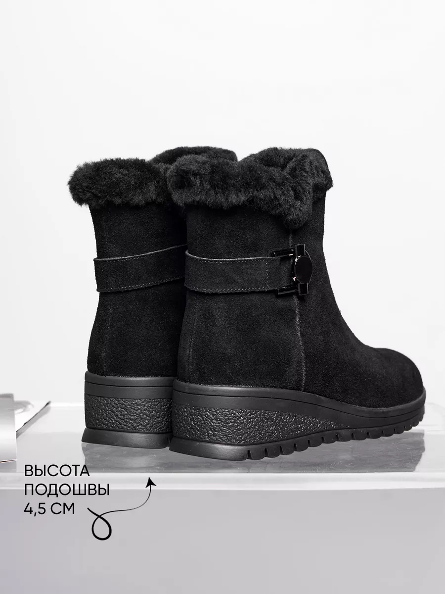 Классические черные замшевые полусапоги с меховой опушкой подходят не только для повседневного ношения, но и для более торжественных случаев. Платформа средней высоты и танкетка обеспечивает комфорт и устойчивость, что делает эту обувь идеальной для активного дня. Непромокаемые материалы и утепленная подкладка из шерсти делают сапоги практичными и надежными для зимних условий.